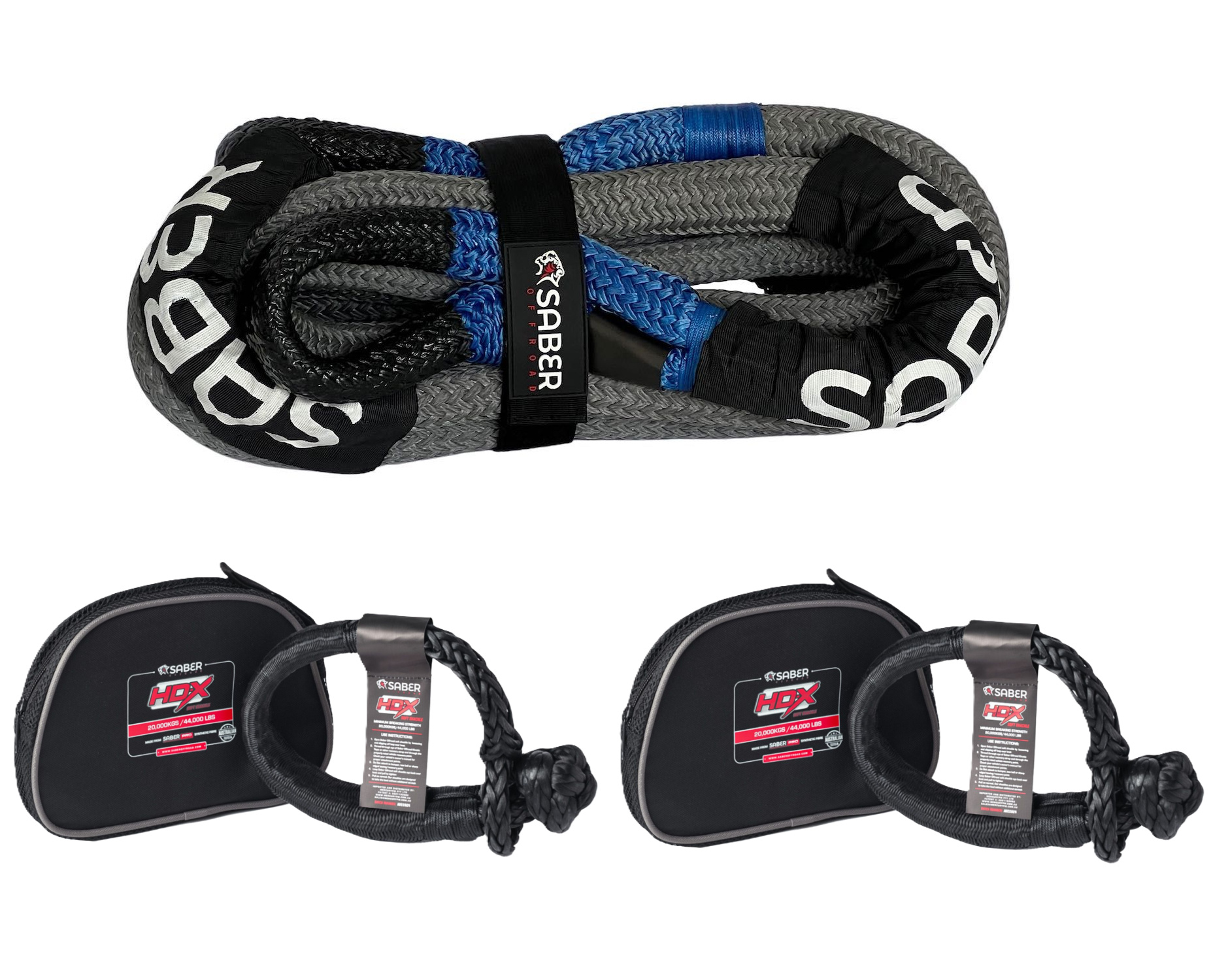 This Recovery kit includes the standard industry-leading Kinetic Recovery Rope rated at 16,000kg, two 20,000 SaberPro Bound Soft Shackles and an Rope Gear Bag. This is the safest recovery kit on the market today.