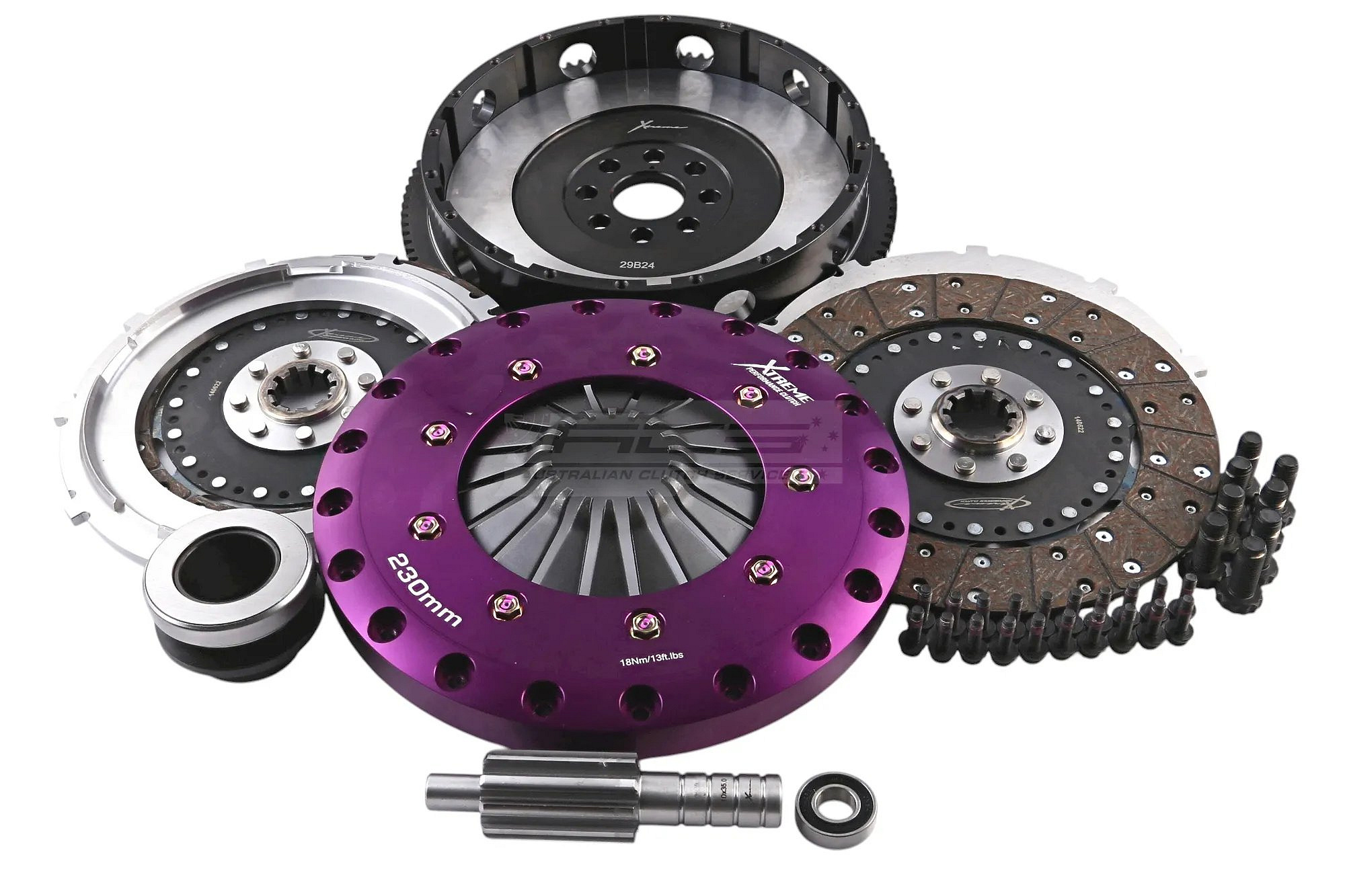 Xtreme 230 mm Twin Plate Clutch představuje vrcholné řešení pro aplikace s velmi vysokým výkonem. Kombinuje mimořádnou přenosovou kapacitu s lehkou konstrukcí. Každá sada obsahuje odlehčený hliníkový přítlačný kryt, volitelné třecí lamely, výkonnostní setrvačník a veškeré potřebné příslušenství – ložisko, šrouby a centrovací trn. Tyto spojky lze přizpůsobit různým typům vozidel díky možnosti použití vnitřních hydraulických ložisek a konverzí pull–push.