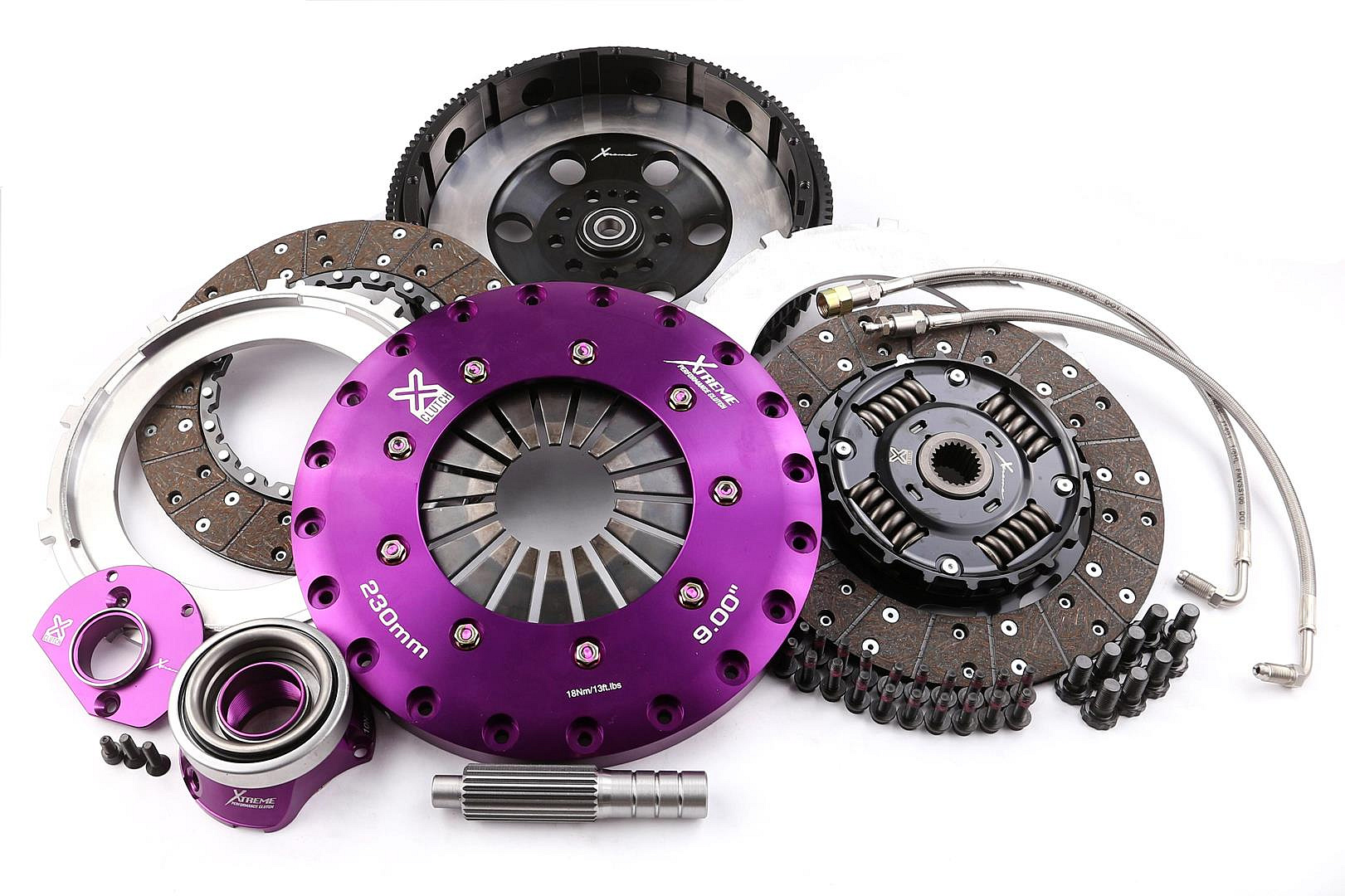 Xtreme 230 mm Twin Plate Sprung Organic Clutch je špičkové řešení pro vozy s velmi vysokým výkonem, které zároveň vyžadují snížené rázy v převodovce oproti pevným (rigid) lamelám. Spojka poskytuje mimořádnou přenosovou kapacitu při zachování nízké hmotnosti. Každá sada zahrnuje lehký hliníkový přítlačný kryt, odpružené organické lamely, výkonnostní setrvačník a kompletní montážní příslušenství včetně ložiska, šroubů a centrovacího trnu.