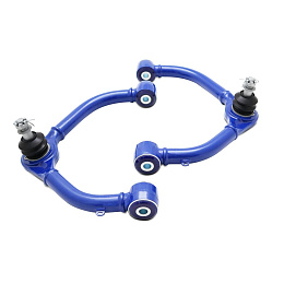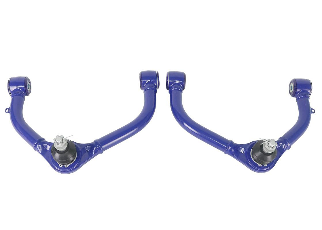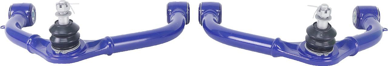 Pevné horní příčné rameno s posunutím, osazené zesíleným kulovým čepem s vysokým rozsahem pohybu a polyuretanovými silentbloky SuperPro, určeno pro vozy se zvednutým podvozkem o 2 až 4 palce.