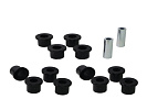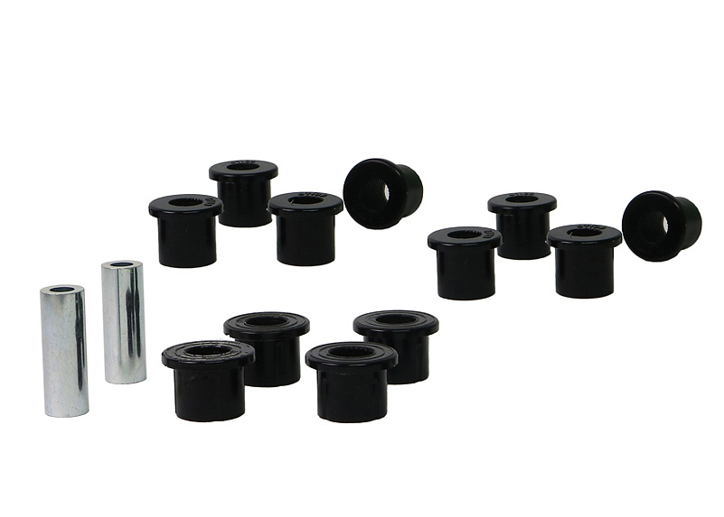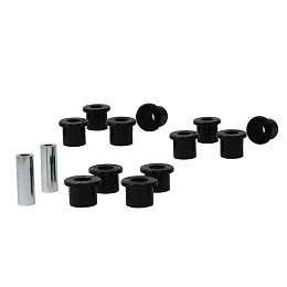 Kompletní servisní sada silentbloků pro listové pružiny, která obsahuje pouzdra pro přední i zadní oka listu a také pro čepy třmenů. Vysoký nájezd a časté převážení těžkých nákladů způsobují nadměrné opotřebení gumových silentbloků. Černé silentbloky Whiteline jsou navrženy pro maximální odolnost proti oděru, vysokou nosnost (ideální pro 4WD, užitkové vozy a tažení), pružnost, zvýšenou pevnost v tahu a odolnost vůči oleji, mastnotě, ozonu i povětrnostním vlivům.